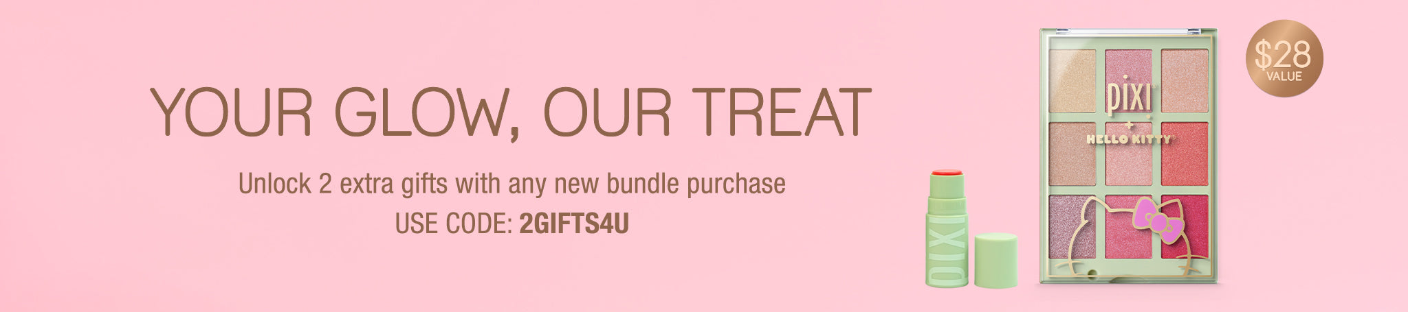 Pixi + Hello Kitty Palette with HydraLip Treat on a pink background. 28 Value callout